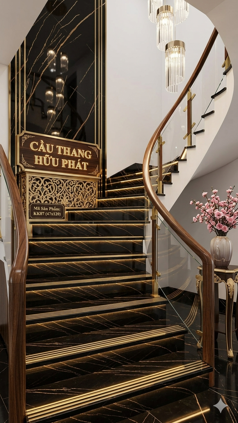 Điểm nhấn mũi bậc: Thiết kế tích hợp 3 đường chỉ vàng mạ kim chạy dọc theo mũi bậc, giúp bộ cầu thang trở nên nổi bật và lộng lẫy hơn dưới ánh đèn.