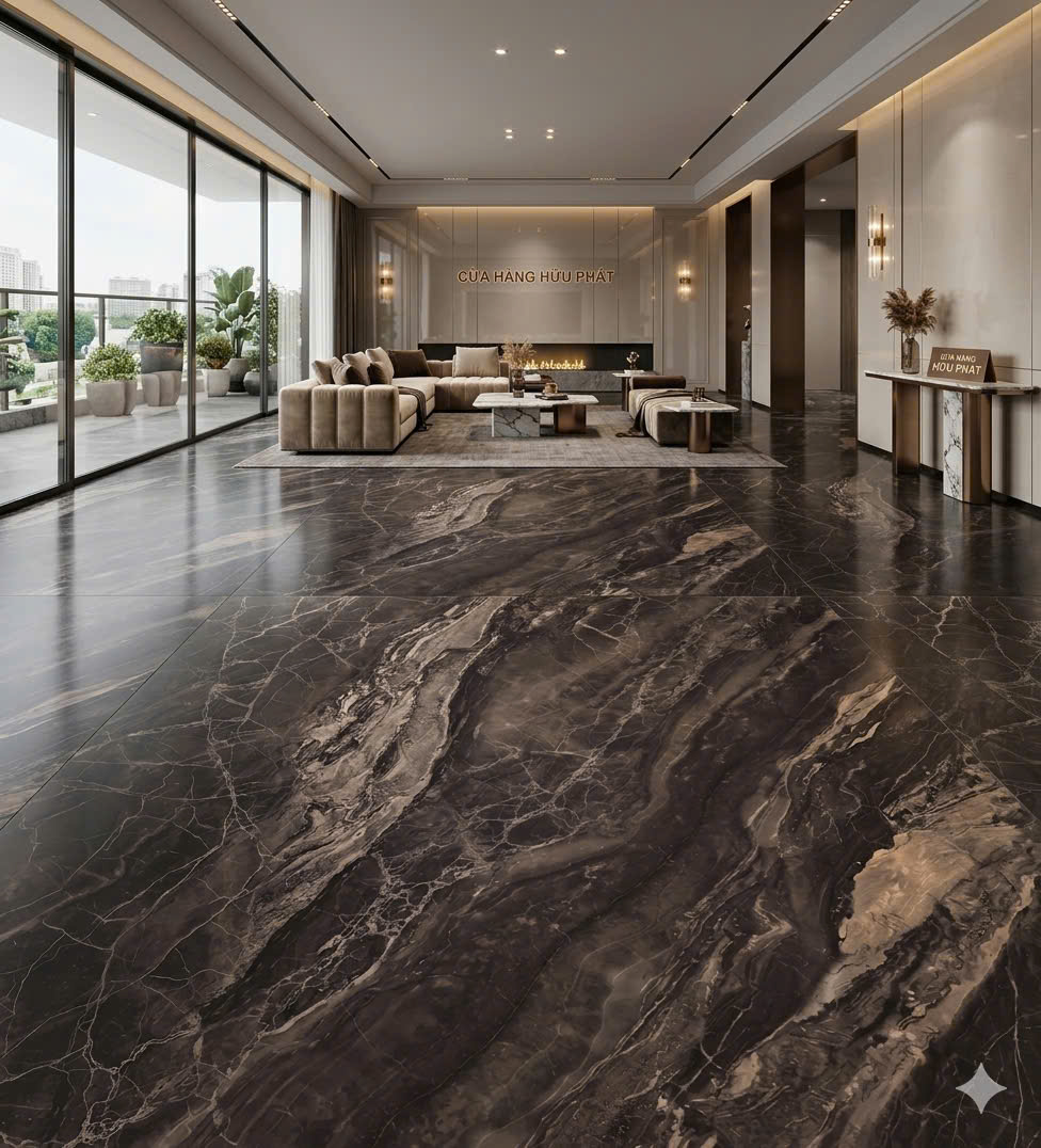 Mẫu gạch 100CC66 trong ảnh mang vẻ đẹp đậm chất nghệ thuật, mô phỏng dòng đá Marble Brown cao cấp với chiều sâu không gian rất tốt. Đây là lựa chọn lý tưởng cho những gia chủ yêu thích sự điềm tĩnh, sang trọng và có phần bí ẩn.